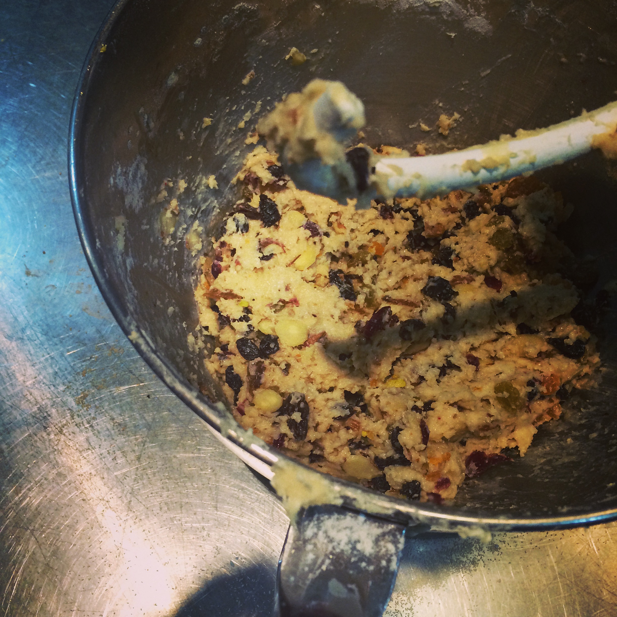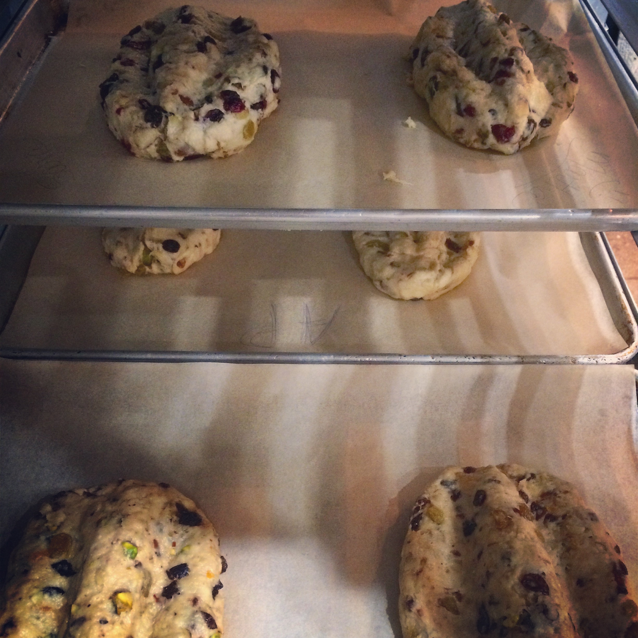 Next, we started on the more complex Pannetone and Stöllen. Both breads are filled with dried fruits, raisins, candied orange rinds and nuts. And butter.