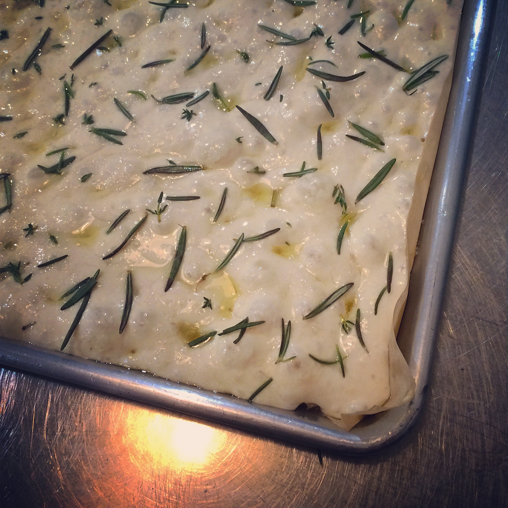 We started with a simple Focaccia bread, which basically uses the same dough that I use for my basic boule, just spread out on the pan with liberal amounts of olive oil and salt. Plus any herbs, olives, or cheese you feel like adding.