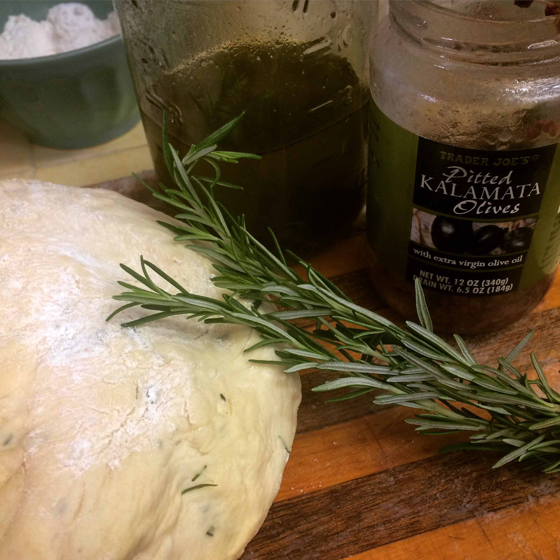 Here are some images before and after the olive oil mixture is added to the dough (notice the sheen). I doubled the recipe so I could make a really large loaf, and then tried a swirly pattern, to be all fancy.