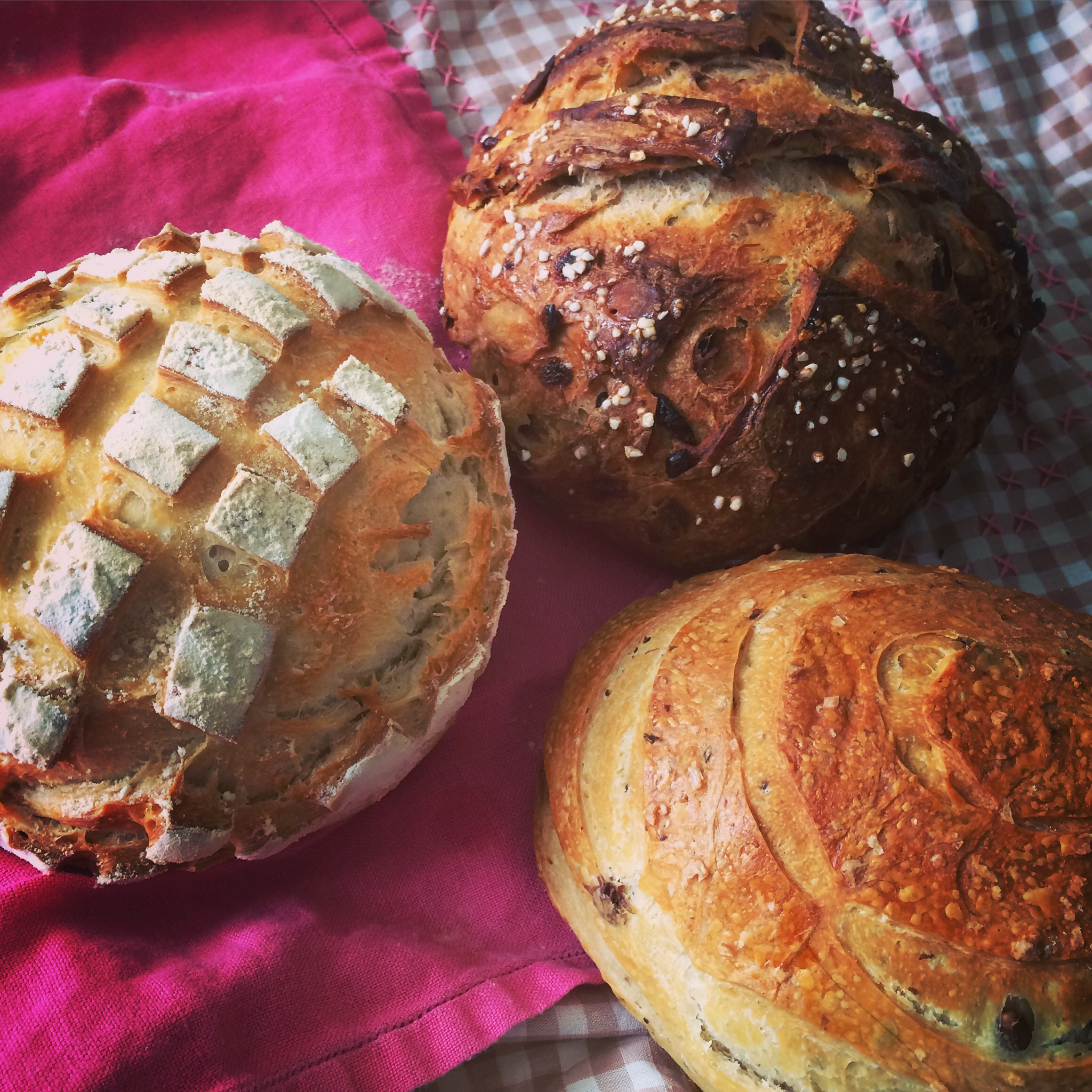 Made a double batch and separated it into (3) loaves. Sourdough, dried fruit with cinnamon swirl, and olive tapenade.