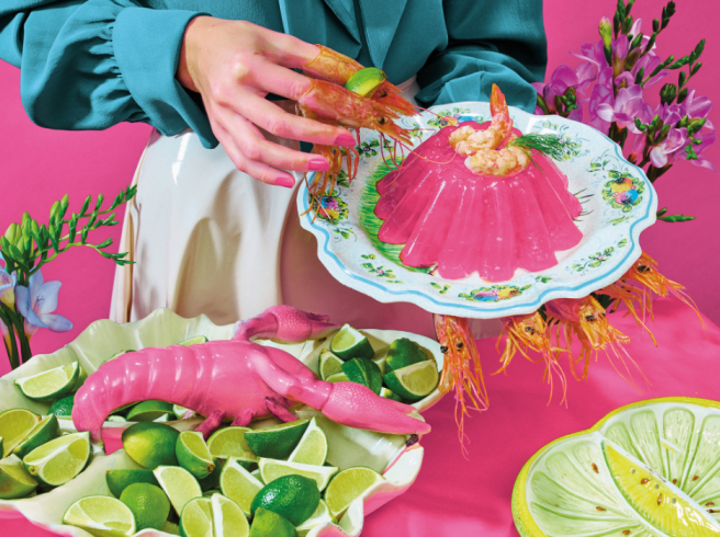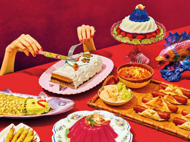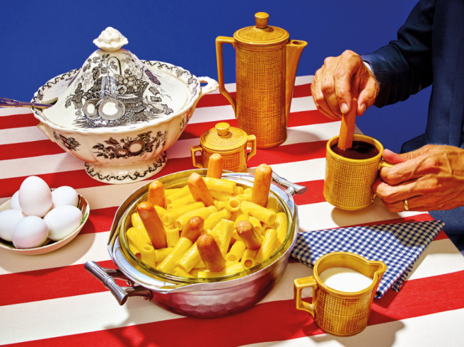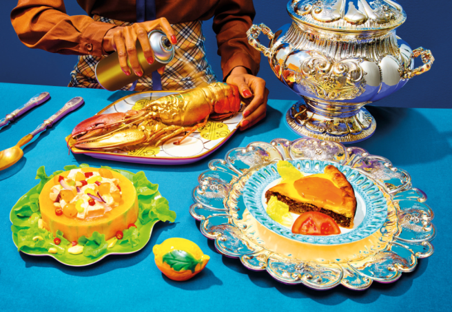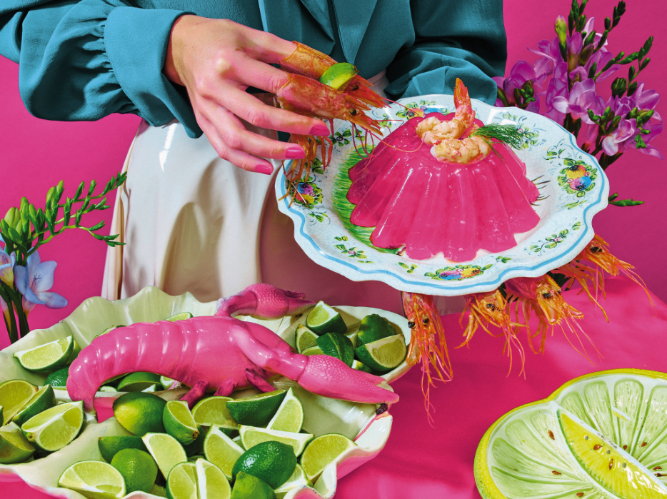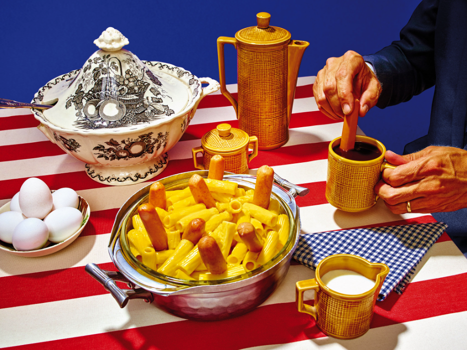 The New York Times Magazine asked the artists Maurizio Cattelan and Pierpaolo Ferrari to interpret the 1971 Betty Crocker Recipe Card Library. While photographing the dishes, Cattelan said they styled the food “with humor and without mercy.”