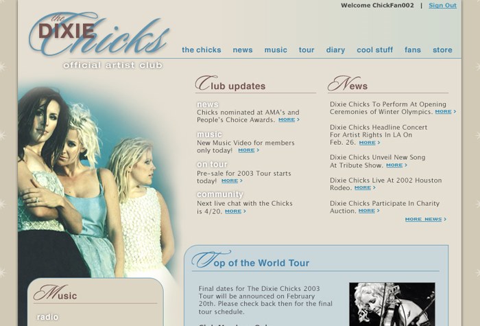 Yahoo! Music offered their services to provide Official Artist Clubs/websites for Dixie Chicks, Enrique Iglesias, Eagles. Note the snazzy underlined links.